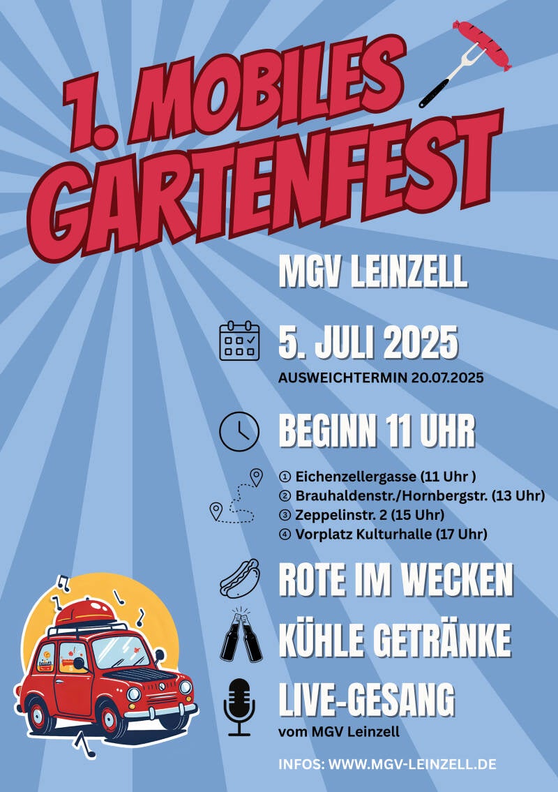 Der MGV Leinzell lädt herzlich ein zum ersten Mobilen Gartenfest am Samstag, 5. Juli 2025 – ein noch nie dagewesenes Erlebnis in Leinzell! Dieses Jahr feiern wir nicht an einem festen Ort, sondern bringen das Gartenfest direkt in die Nachbarschaft: mit Live-Gesang vom MGV und dem gemischten Chor, roter Wurst vom Grill und kühlen Getränken – verteilt auf vier Stationen im Ort.